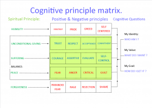 In Cognitive Principle Matrix (CPM) comprises groups of principles. The principle groupings relate to our human nature driven by fear and greed. The first goal in CPM is to control fear by using spiritual principles to control negative principles and negative concerns. The second goal is to control greed by using spiritual principles to develop influencing principles and relationship principles, thereby transcending our human nature and finding pure love. Spiritual principles are used to move a person from the lowest level to the highest level to attain wisdom of love, peace and joy.When we attain this level we realise that love, peace and joy were already inside us and not an external goal to achieve.